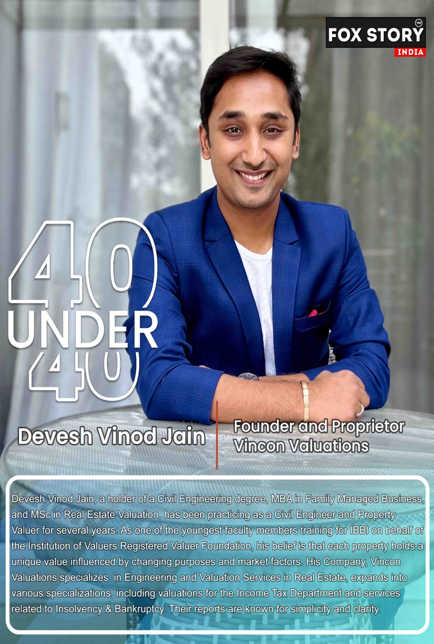 Our Awards Outstanding Entrepreneur of The Year 2023 Award in the civil valuation category. 40 under 40 Award from The Zee Media Group, recognizing young leaders making a positive impact. Promising and Trusted Engineering and Valuation Firm of the Year 2023 under the “Quality Service & Consultation”